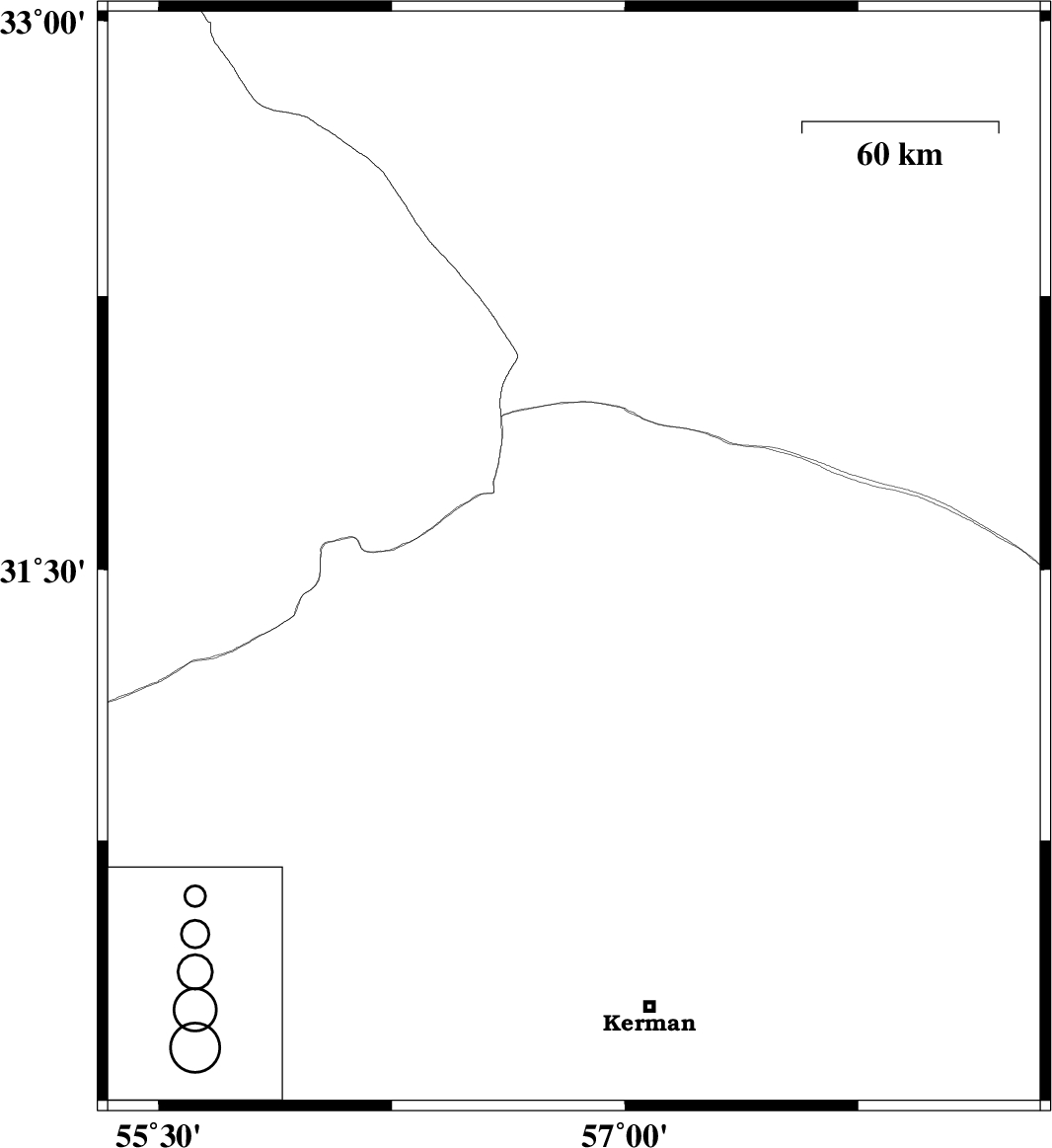 | 2015/07/12 | 14:39:46.8 | 19:09:46.8 | 31.526 | 56.836 | 14 | ML:2.7 | Kerman Province, 29 km North of Ravar |