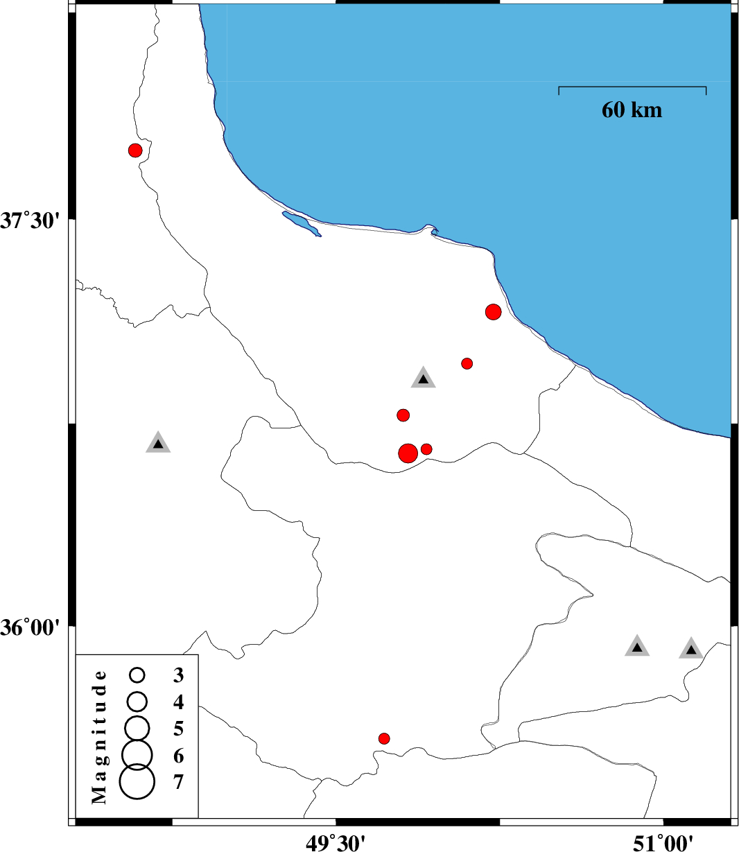 | 2015/06/26 | 11:05:54.3 | 15:35:54.3 | 36.97 | 50.1 | 14 | ML:2.3 | Gilan Province, 14 km South of Amlash | ||