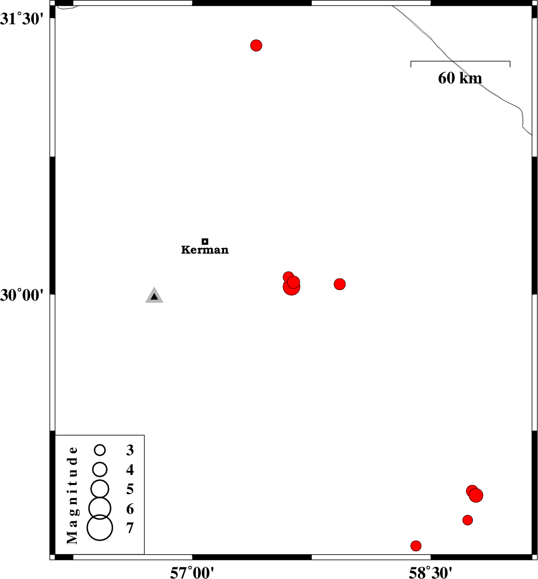 | 2015/07/20 | 14:54:15.1 | 19:24:15.1 | 28.614 | 58.406 | 18 | ML:2.9 | Kerman Province, 55 km South of Bam | ||