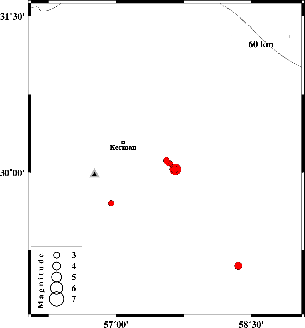 | 2015/08/02 | 16:03:17.3 | 20:33:17.3 | 30.121 | 57.558 | 14 | ML:2.8 | Kerman Province, 50 km South-East of Kerman | ||