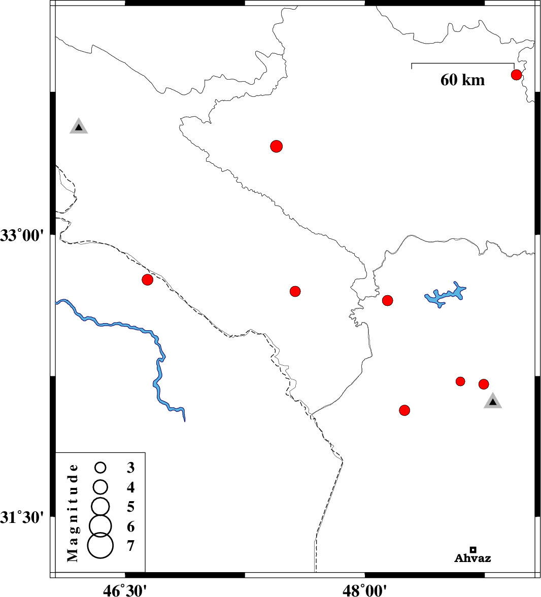 | 2015/08/03 | 15:25:12.5 | 19:55:12.5 | 32.7 | 47.564 | 14 | ML:2.9 | Ilam Province, 28 km -East of Dehloran | ||