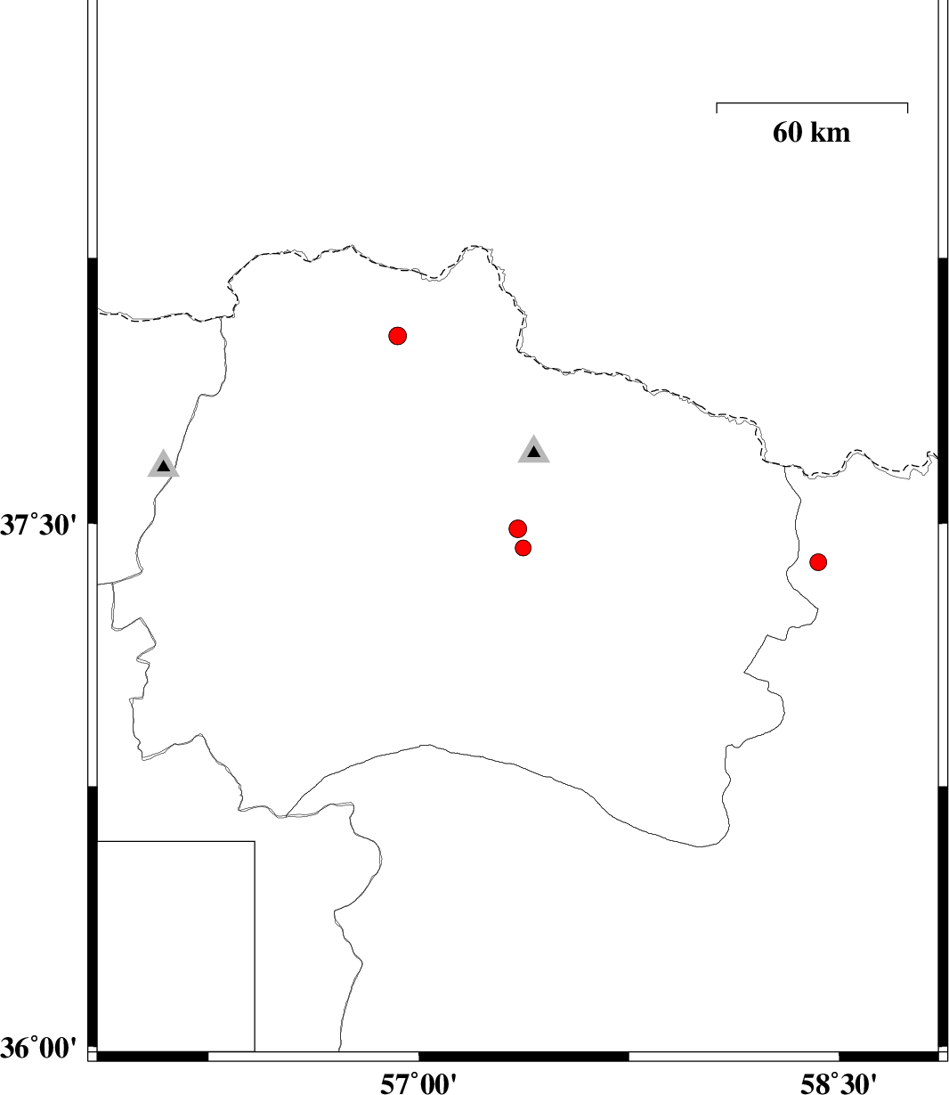 | 2015/07/20 | 09:22:53.1 | 13:52:53.1 | 37.39 | 58.425 | 14 | ML:2.7 | Khorasan(center) Province, 32 km North of Quchan |