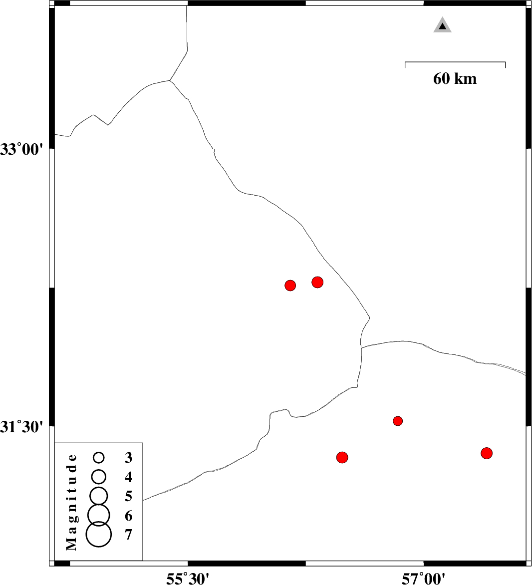 | 2015/07/12 | 14:39:46.8 | 19:09:46.8 | 31.526 | 56.836 | 14 | ML:2.7 | Kerman Province, 29 km North of Ravar |