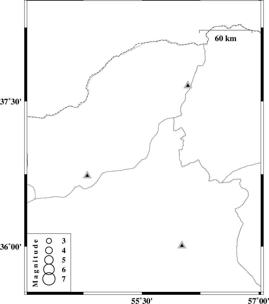 | 2015/08/06 | 21:17:59.3 | 01:47:59.3 | 37.024 | 55.526 | 26 | ML:2.8 | Golestan Province, 26 km South-East of Minodasht |