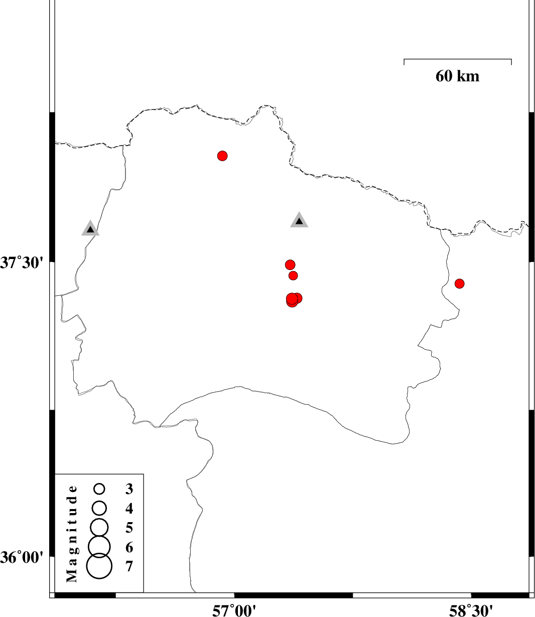 | 2015/08/06 | 06:51:58.9 | 11:21:58.9 | 37.316 | 57.396 | 14 | ML:2.9 | Khorasan(north) Province, 18 km South of Bojnurd | ||