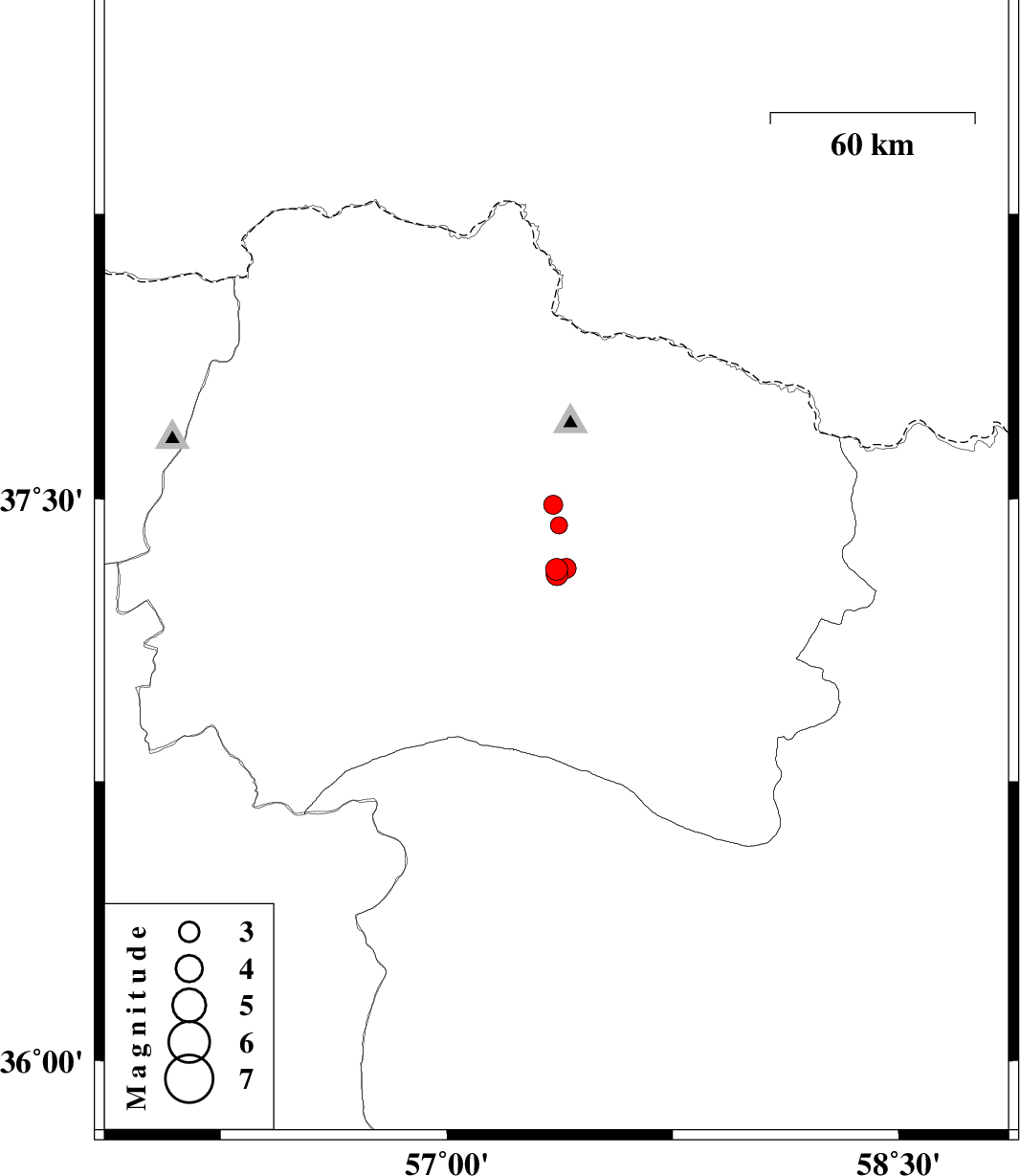 | 2015/08/06 | 06:51:58.9 | 11:21:58.9 | 37.316 | 57.396 | 14 | ML:2.9 | Khorasan(north) Province, 18 km South of Bojnurd | ||