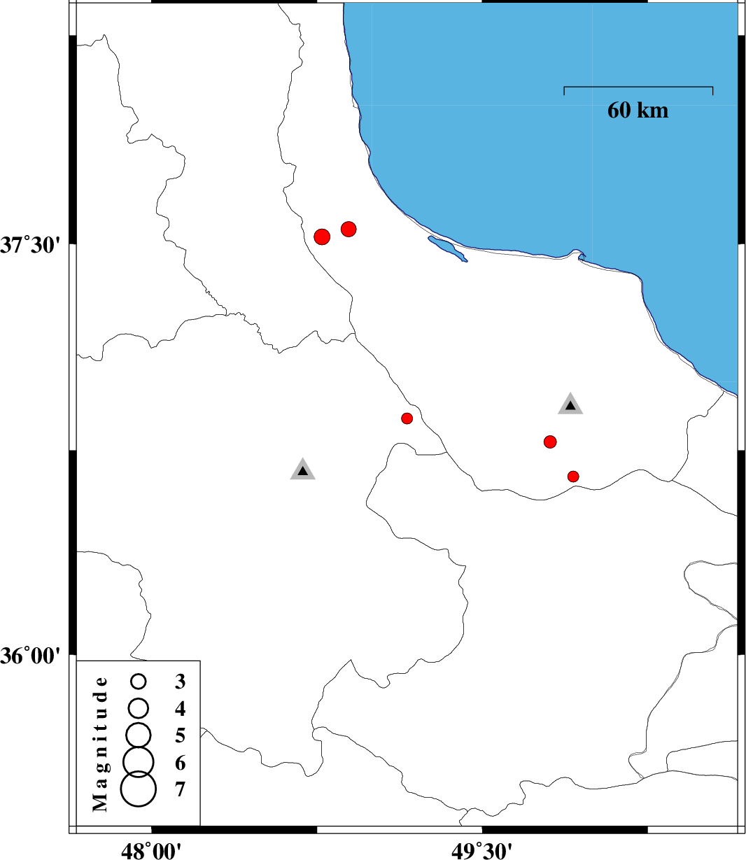 | 2015/07/23 | 06:08:03.1 | 10:38:03.1 | 36.781 | 49.807 | 14 | ML:2.6 | Gilan Province, 34 km -East of Rudbar | ||