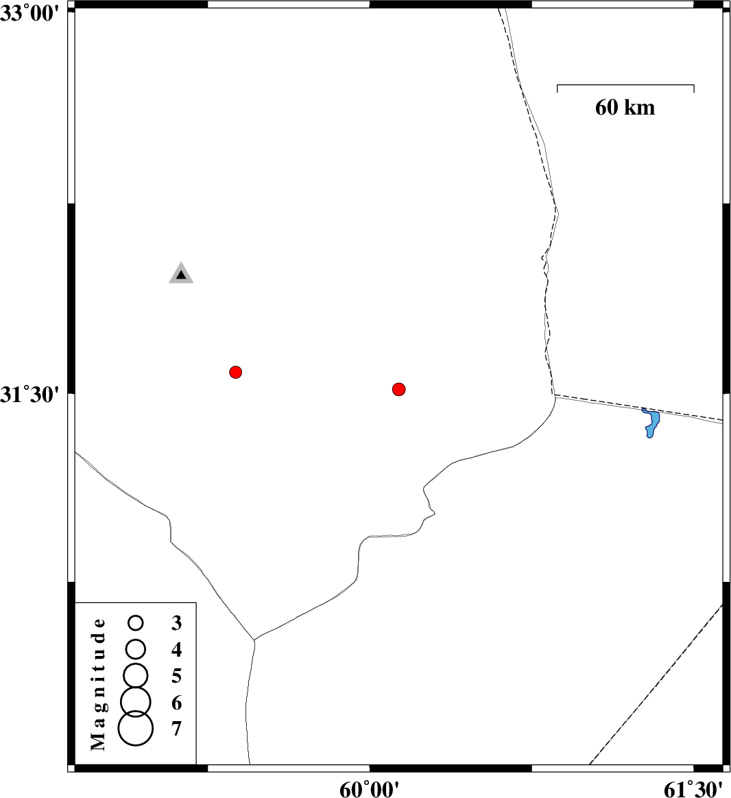 | 2015/08/10 | 17:23:11.2 | 21:53:11.2 | 31.516 | 60.134 | 14 | ML:2.7 | Khorasan(south) Province, 9 km of Nehbandan | ||
