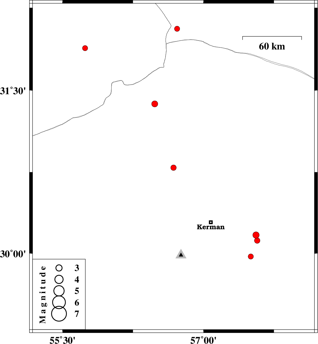 | 2015/08/10 | 18:50:56.1 | 23:20:56.1 | 30.119 | 57.572 | 18 | ML:2.7 | Kerman Province, 51 km South-East of Kerman | ||