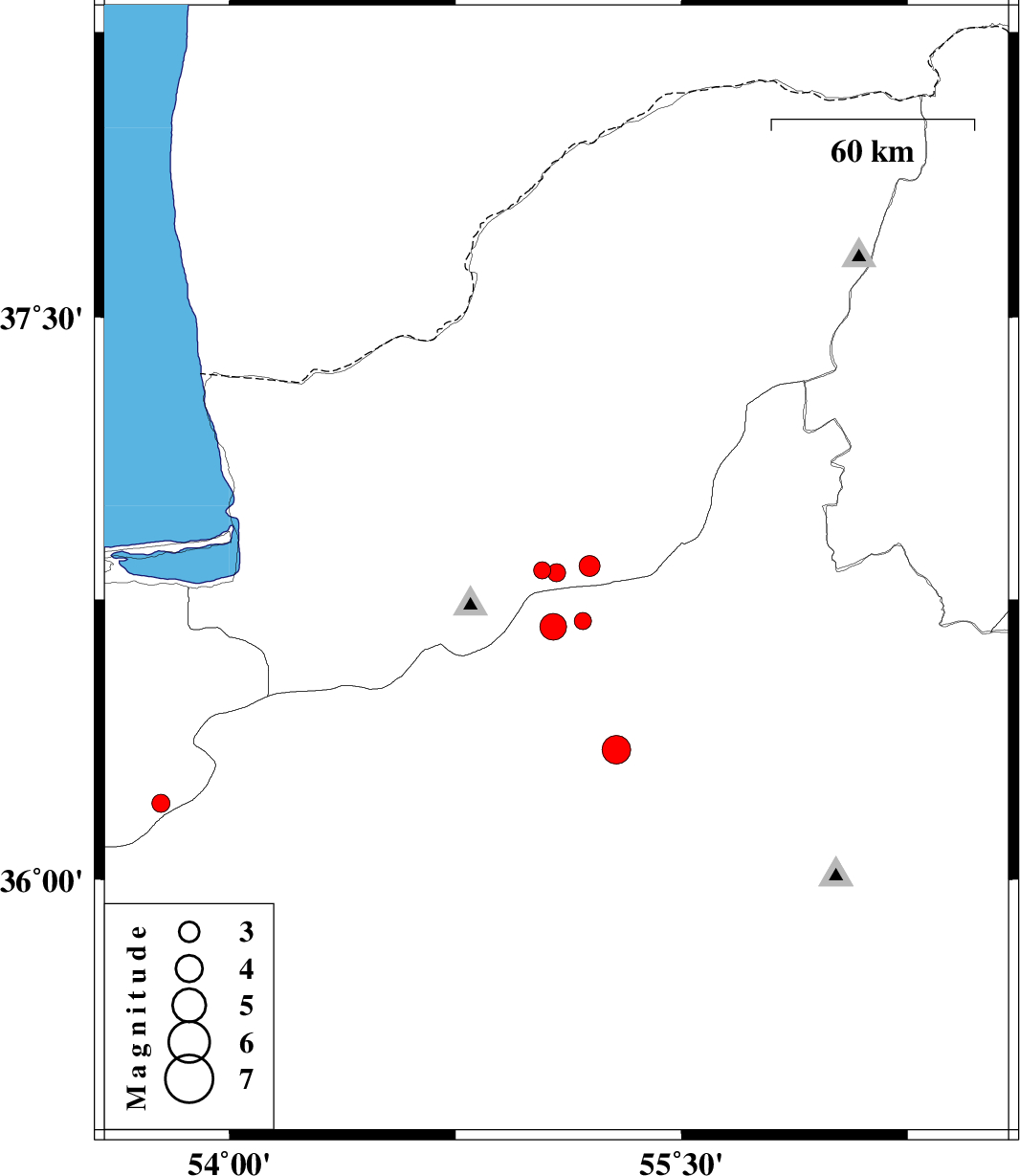 | 2015/08/17 | 20:37:20.0 | 01:07:20.0 | 36.822 | 55.085 | 6 | ML:2.7 | Golestan Province, 22 km South of Ramian | ||