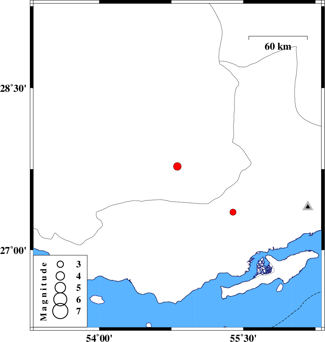 | 2015/08/12 | 03:36:56.6 | 08:06:56.6 | 27.351 | 55.392 | 18 | ML:2.9 | Hormozgan Province, 90 km North-West of Bandar-e abbas |