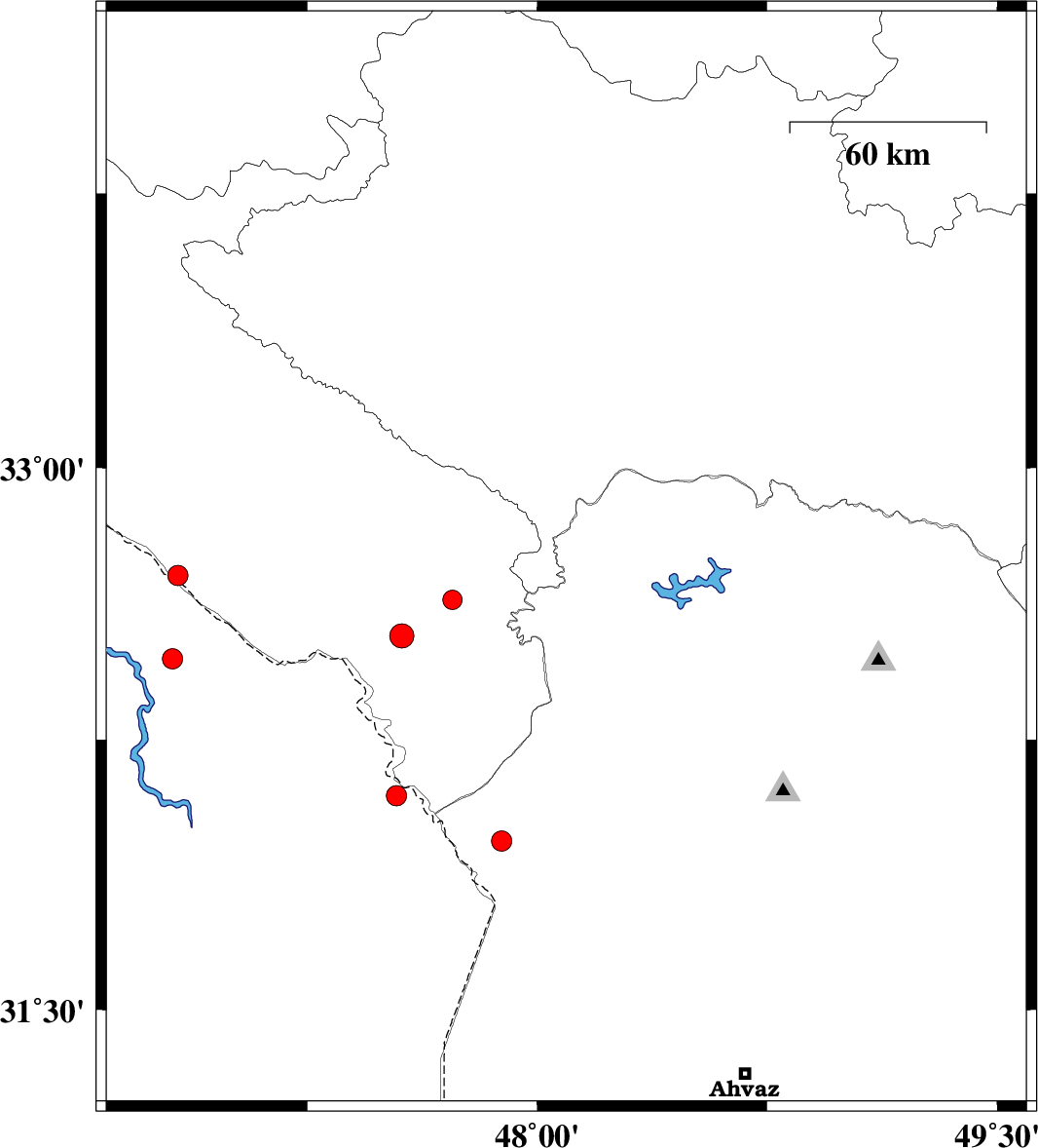 | 2015/08/25 | 16:16:01.3 | 20:46:01.3 | 32.815 | 48.213 | 37 | ML:2.8 | Khoozestan Province, 42 km North-West of Andimeshk | ||