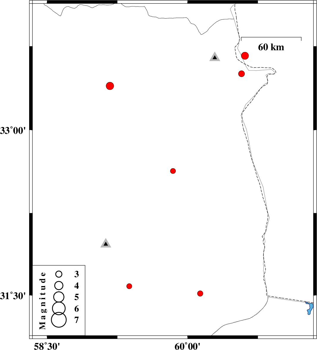 | 2015/07/26 | 22:27:31.9 | 02:57:31.9 | 31.583 | 59.378 | 9 | ML:2.6 | Khorasan(south) Province, 63 km -West of Nehbandan |