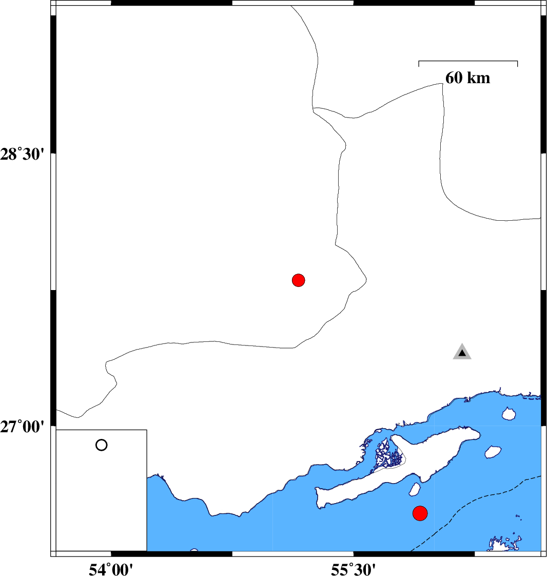 | 2015/08/27 | 00:24:22.6 | 04:54:22.6 | 26.514 | 55.911 | 17 | ML:4.1 | Persian Gulf, 60 km South-West of Qeshm |