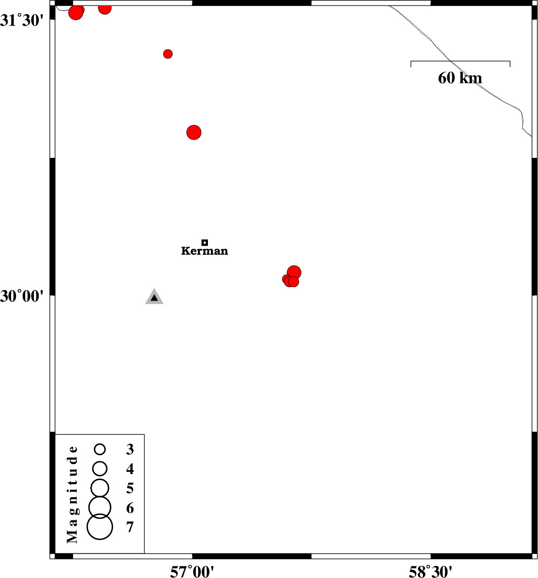 | 2015/08/25 | 02:27:41.6 | 06:57:41.6 | 30.088 | 57.595 | 14 | ML:2.6 | Kerman Province, 54 km South-East of Kerman | ||