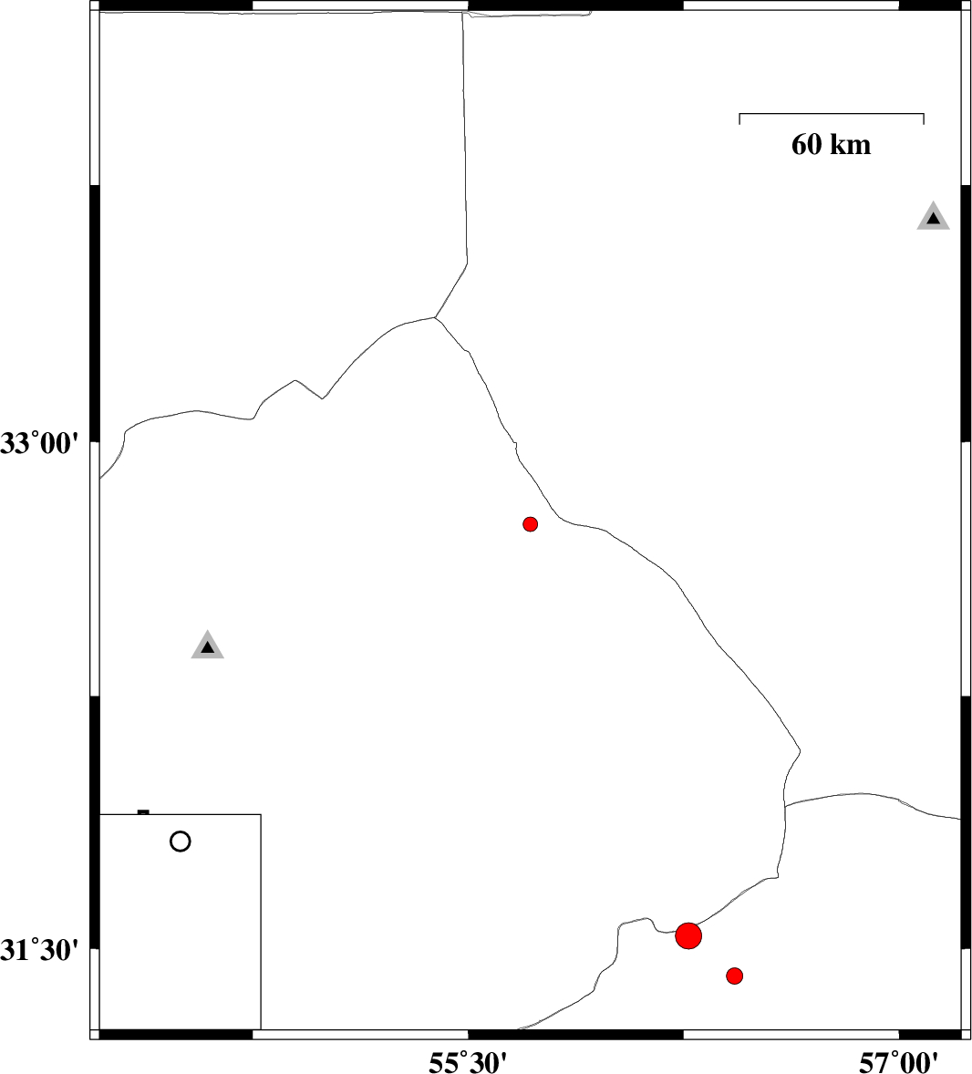 | 2015/09/01 | 14:29:29.5 | 18:59:29.5 | 32.757 | 55.716 | 15 | ML:2.3 | Yazd Province, 132 km North-East of Bafq | ||