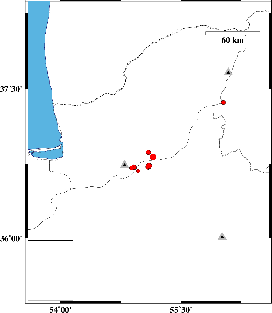 | 2015/08/29 | 07:52:36.9 | 12:22:36.9 | 36.719 | 55.094 | 6 | ML:3 | Semnan Province, 33 km South of Ramian |