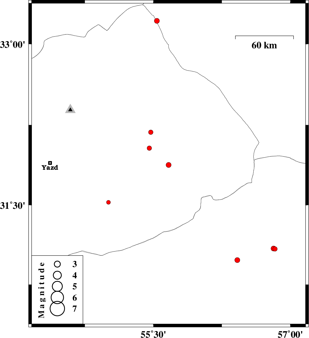 | 2015/09/08 | 09:55:35.7 | 14:25:35.7 | 31.526 | 55.008 | 6 | ML:2 | Yazd Province, 38 km -West of Bafq | ||