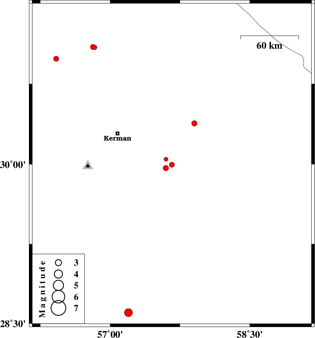 | 2015/09/10 | 07:35:06.8 | 12:05:06.8 | 29.996 | 57.663 | 18 | ML:2.6 | Kerman Province, 65 km South-East of Kerman | ||
