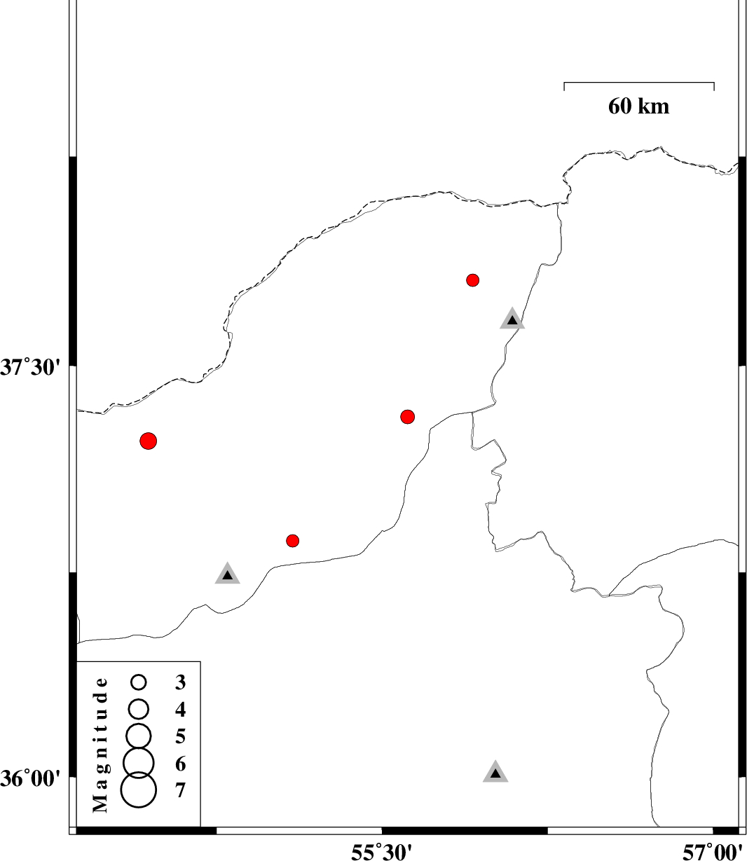 | 2015/09/05 | 05:27:49.4 | 09:57:49.4 | 36.864 | 55.095 | 14 | ML:2.5 | Golestan Province, 17 km South of Ramian |