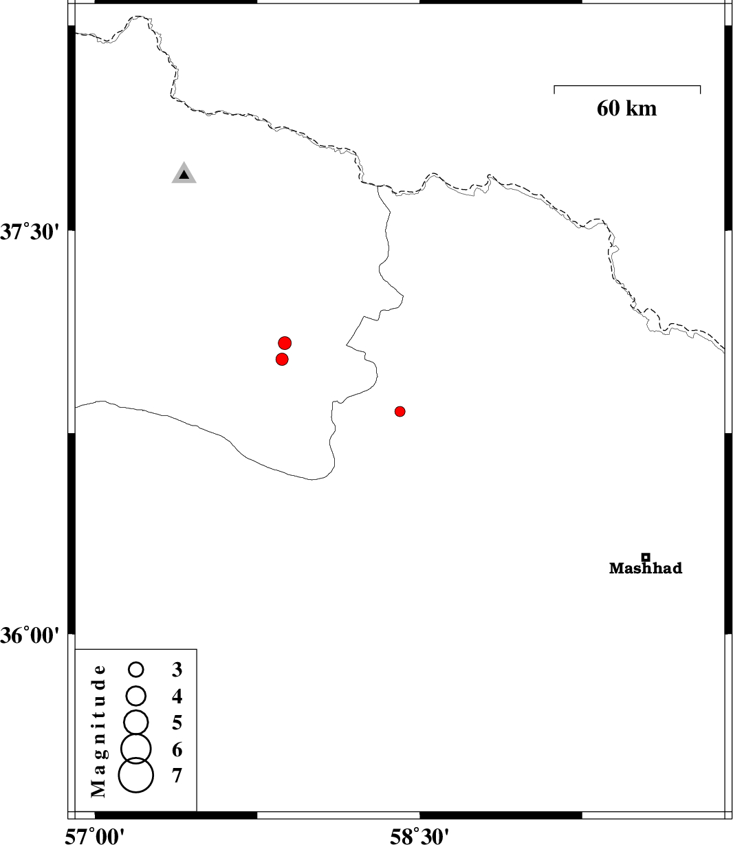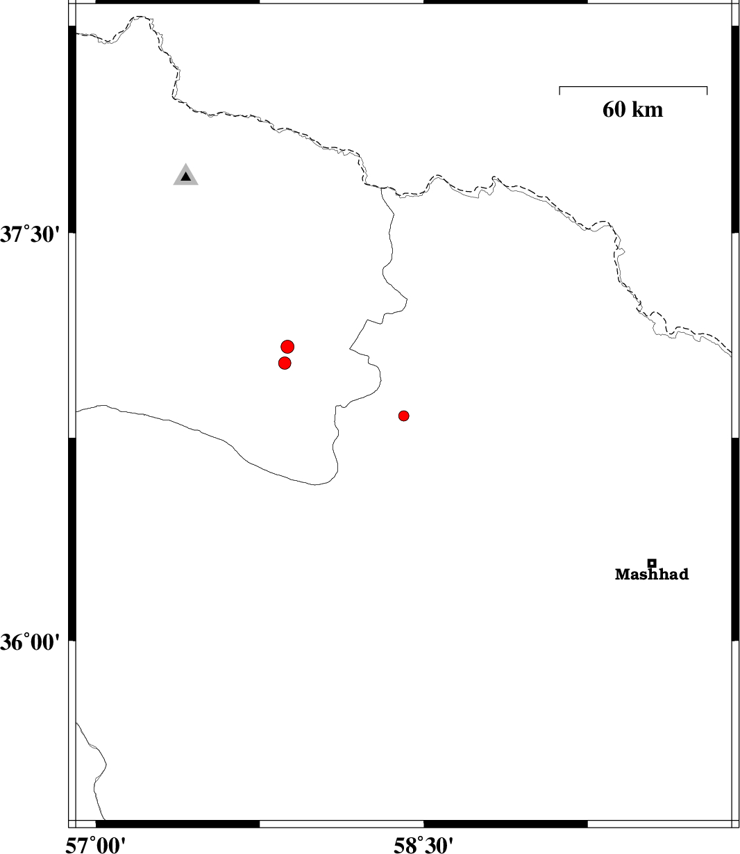 | 2015/09/10 | 03:20:39.6 | 07:50:39.6 | 36.83 | 58.408 | 18 | ML:2.1 | Khorasan(center) Province, 32 km South of Quchan | ||
