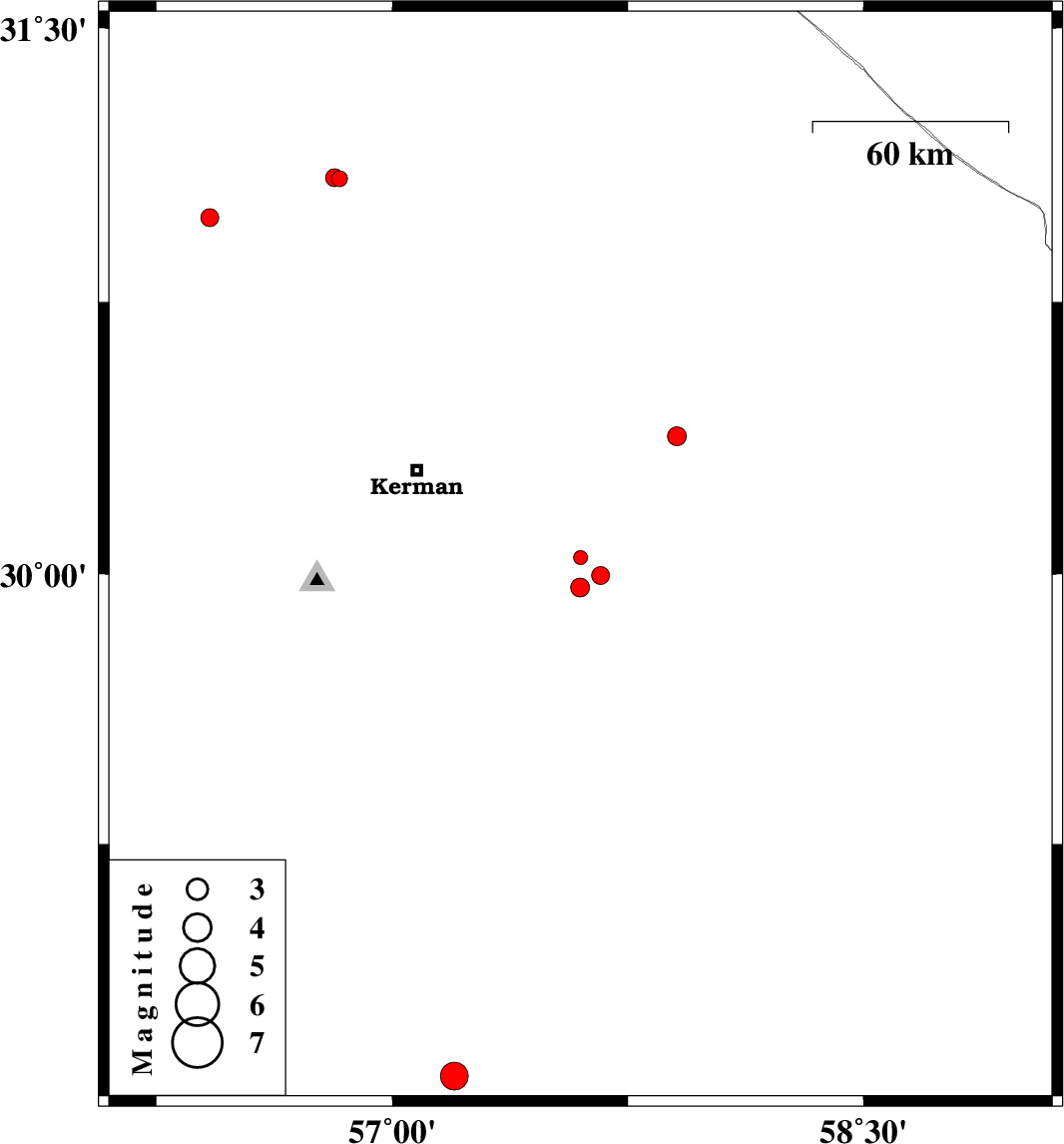 | 2015/09/04 | 15:32:31.5 | 20:02:31.5 | 29.963 | 57.598 | 15 | ML:2.7 | Kerman Province, 62 km South-East of Kerman | ||