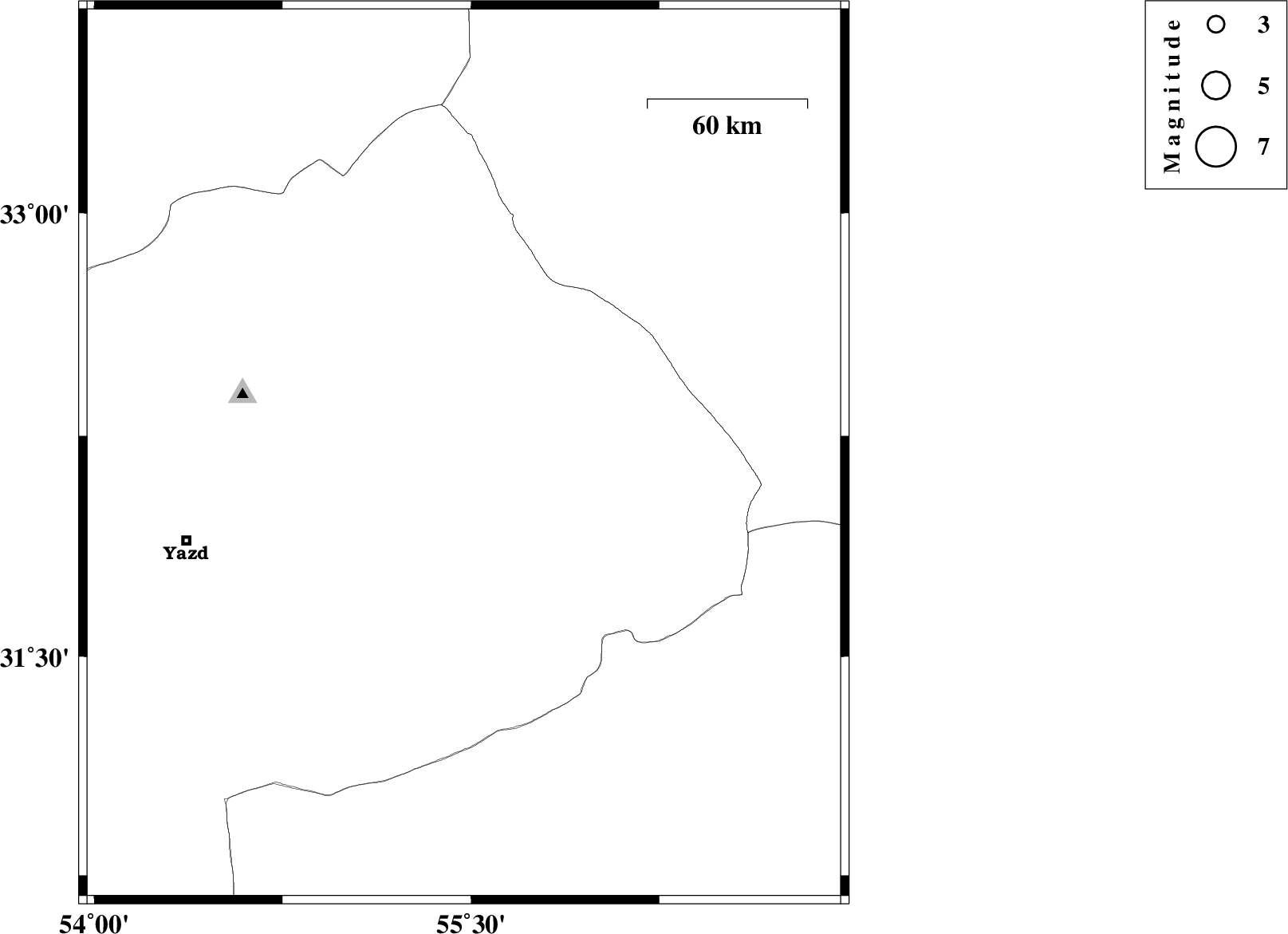 | 2015/09/10 | 09:36:54.6 | 14:06:54.6 | 32.182 | 55.472 | 14 | ML:2.2 | Yazd Province, 65 km North of Bafq | ||