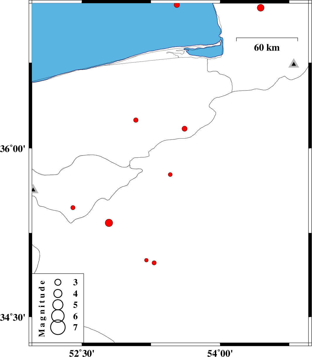 | 2015/09/11 | 05:08:40.4 | 09:38:40.4 | 34.983 | 53.285 | 17 | ML:2.1 | Semnan Province, 66 km South-West of Semnan | ||