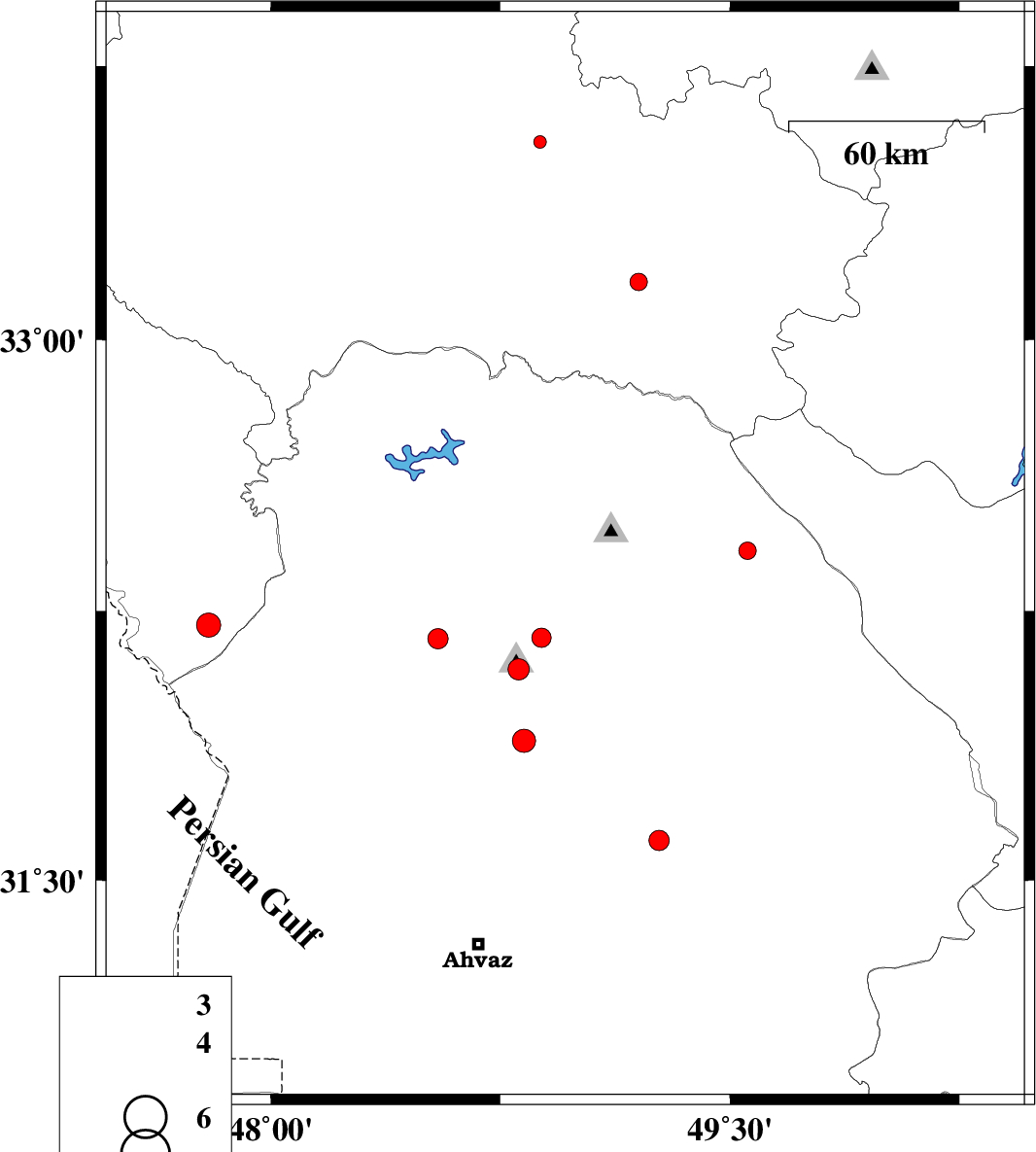 | 2015/09/14 | 23:38:13.8 | 04:08:13.8 | 32.399 | 48.962 | 37 | ML:3.1 | Khoozestan Province, 14 km -West of Lali | ||