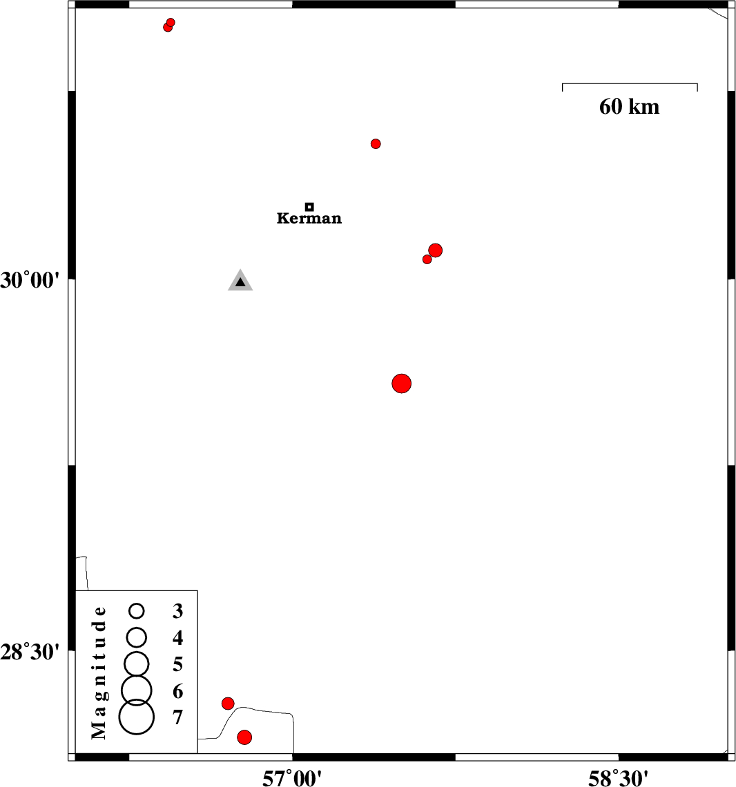 | 2015/09/11 | 00:55:47.6 | 05:25:47.6 | 30.078 | 57.62 | 14 | ML:1.8 | Kerman Province, 57 km South-East of Kerman |