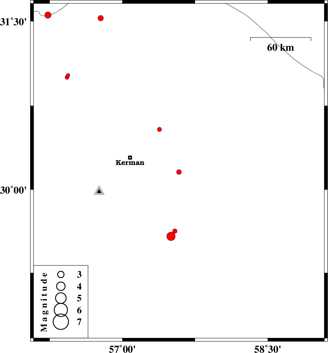 | 2015/09/16 | 22:03:54.1 | 02:33:54.1 | 30.539 | 57.383 | 14 | ML:2 | Kerman Province, 40 km North-East of Kerman | ||