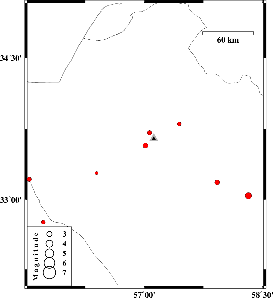 | 2015/09/22 | 09:20:53.8 | 12:50:53.8 | 33.573 | 57.013 | 7 | ML:3 | Yazd Province, 9 km of Tabas | ||