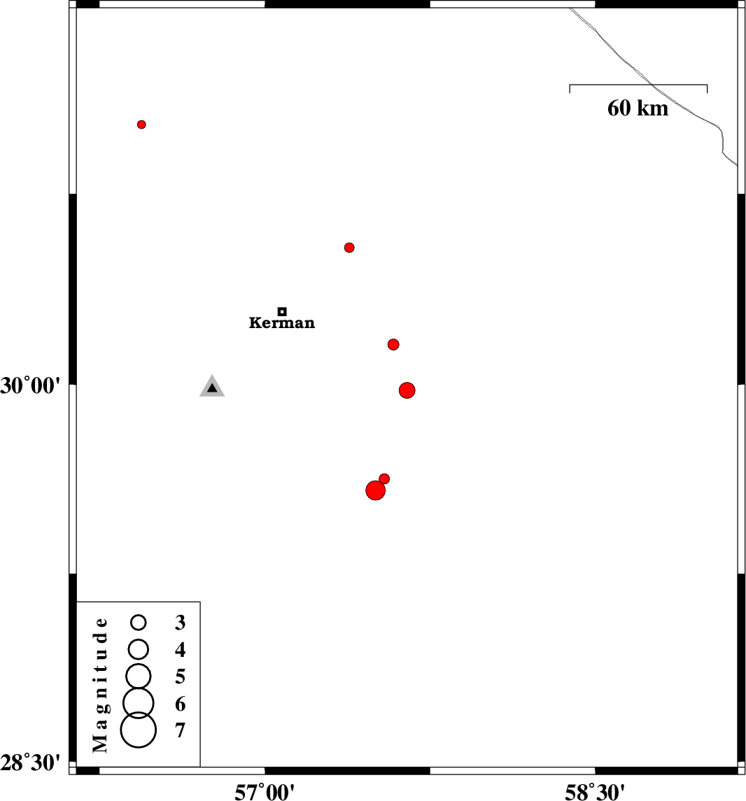 | 2015/09/16 | 22:03:54.1 | 02:33:54.1 | 30.539 | 57.383 | 14 | ML:2 | Kerman Province, 40 km North-East of Kerman |