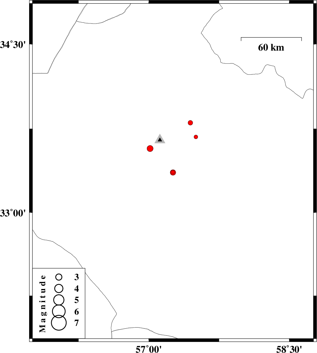 | 2015/09/25 | 03:32:10.1 | 07:02:10.1 | 33.362 | 57.257 | 14 | ML:1.9 | Yazd Province, 40 km South-East of Tabas | ||