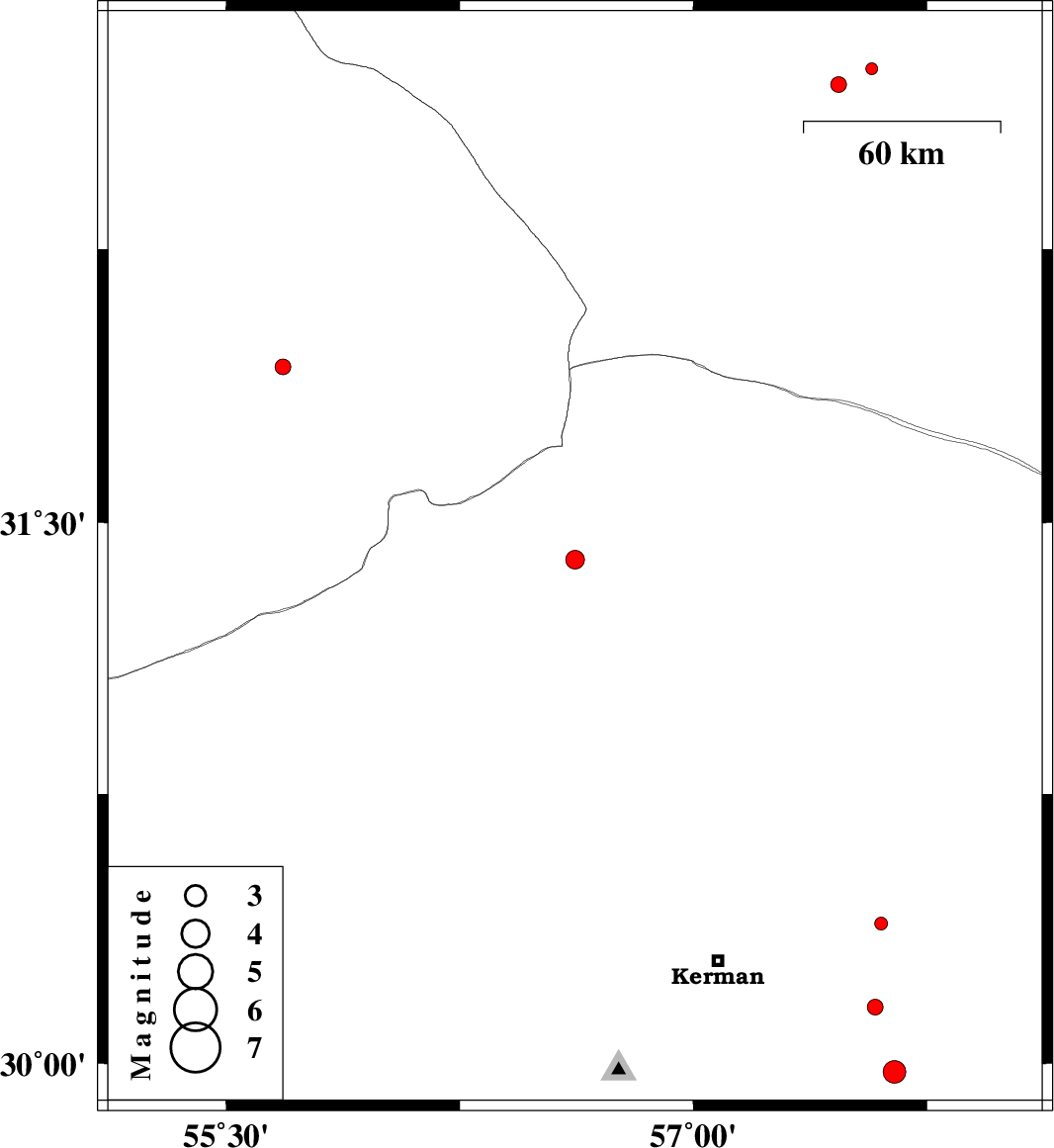 | 2015/09/22 | 00:33:13.1 | 04:03:13.1 | 29.977 | 57.645 | 18 | ML:3.2 | Kerman Province, 64 km South-East of Kerman | ||
