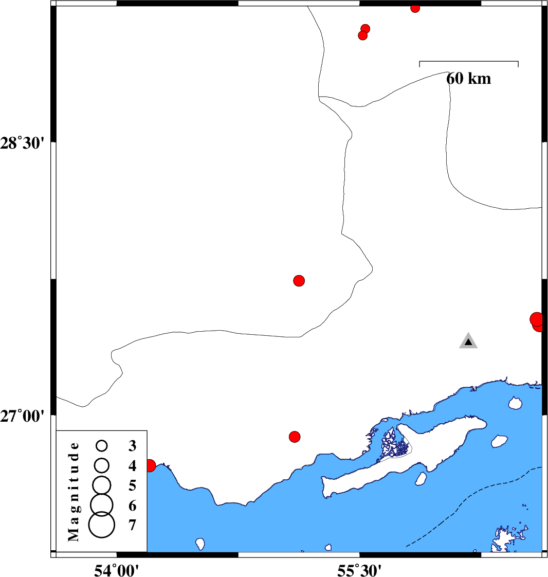 | 2015/09/27 | 02:23:01.4 | 05:53:01.4 | 26.879 | 55.098 | 28 | ML:3.1 | Hormozgan Province, 46 km North-East of Bandar-e lengeh | ||