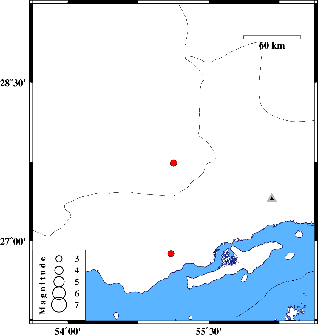 | 2015/09/27 | 02:23:01.4 | 05:53:01.4 | 26.879 | 55.098 | 28 | ML:3.1 | Hormozgan Province, 46 km North-East of Bandar-e lengeh |