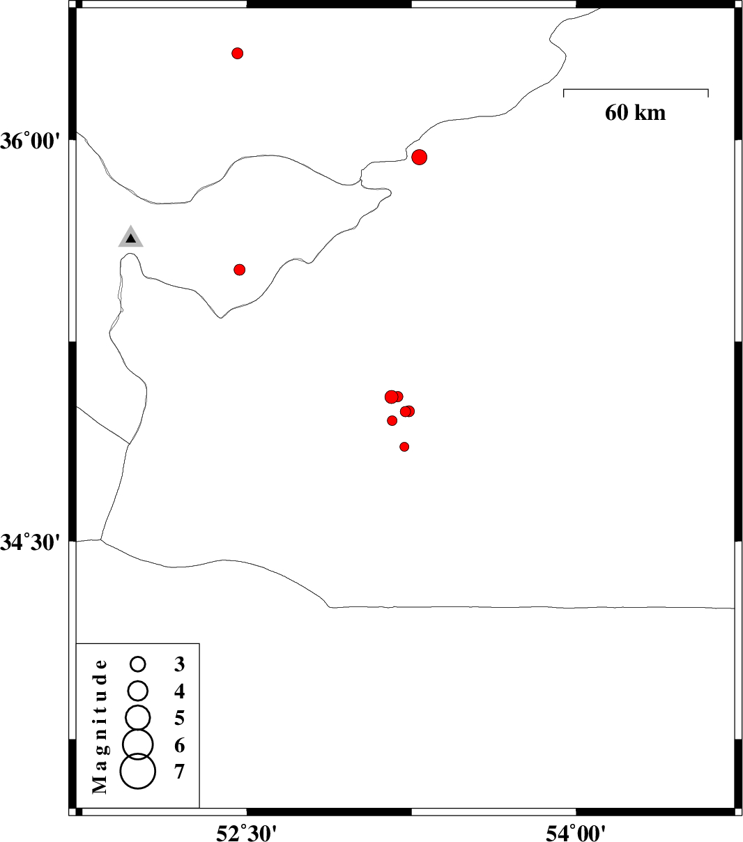| 2015/09/30 | 04:14:39.3 | 07:44:39.3 | 34.987 | 53.222 | 14 | ML:2.1 | Semnan Province, 66 km South-West of Semnan | ||