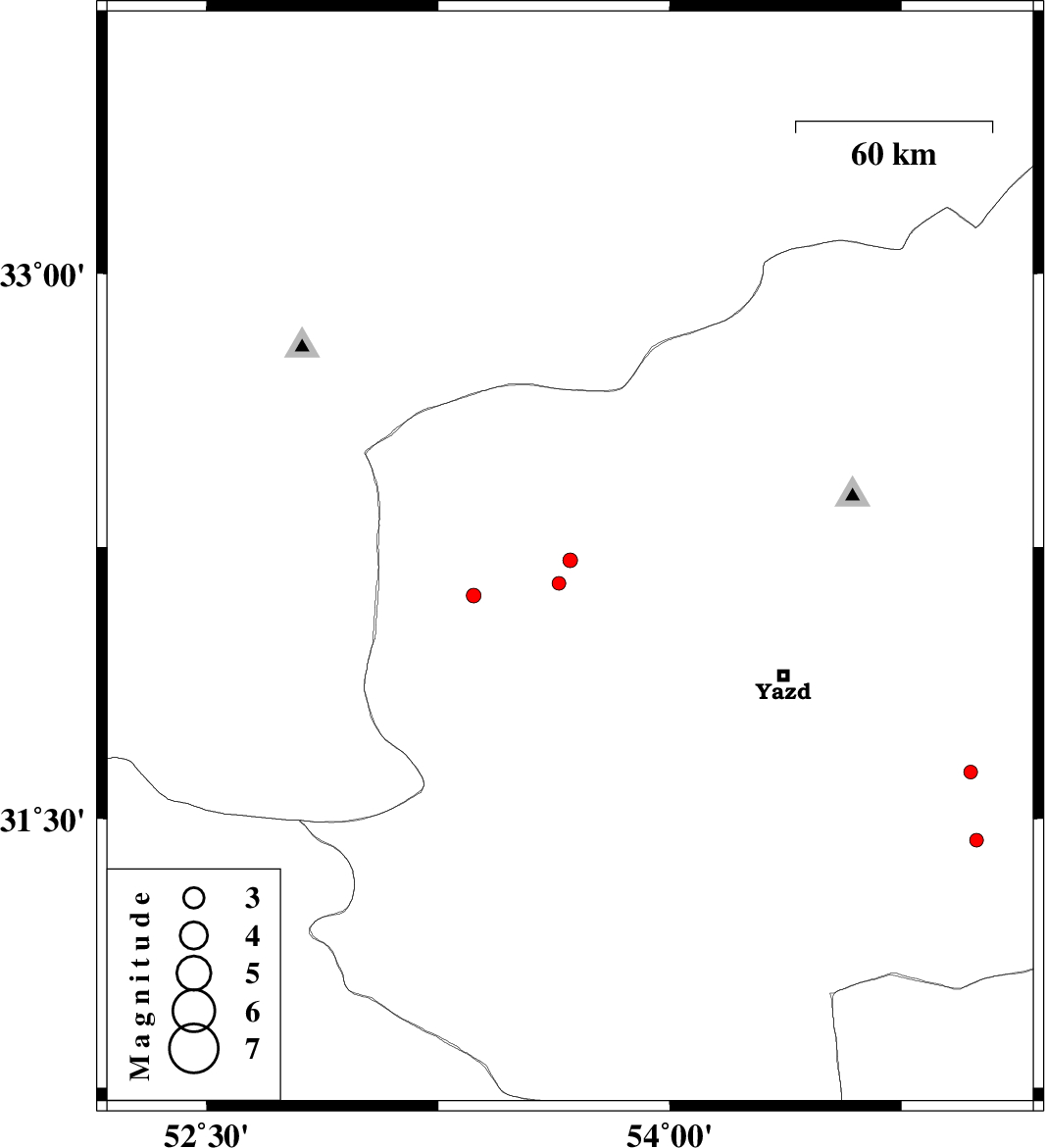 | 2015/09/24 | 11:49:31.9 | 15:19:31.9 | 32.116 | 53.364 | 6 | ML:2.1 | Yazd Province, 63 km South-West of Meybod |