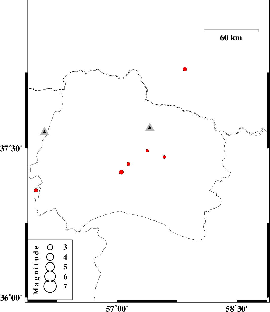 | 2015/10/03 | 04:05:05.5 | 07:35:05.5 | 37.475 | 57.379 | 27 | ML:1.7 | Khorasan(north) Province, 4 km of Bojnurd | ||