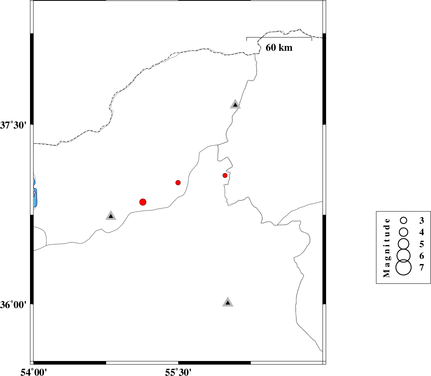 | 2015/09/30 | 15:08:51.9 | 18:38:51.9 | 36.856 | 55.131 | 14 | ML:3.1 | Golestan Province, 18 km South of Ramian |