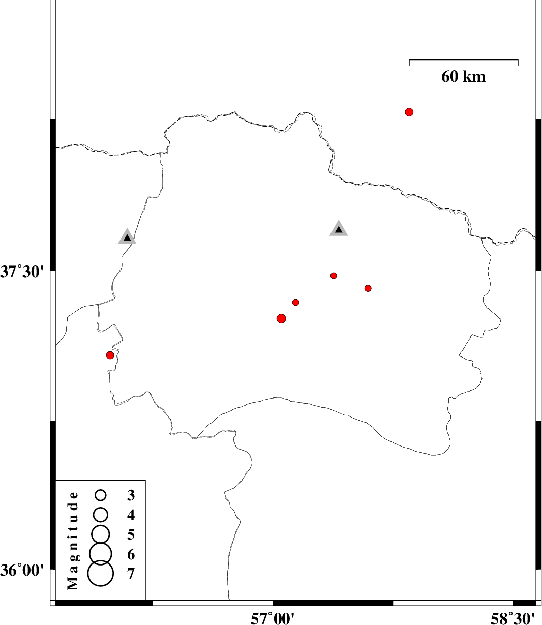 | 2015/10/03 | 04:05:05.5 | 07:35:05.5 | 37.475 | 57.379 | 27 | ML:1.7 | Khorasan(north) Province, 4 km of Bojnurd | ||