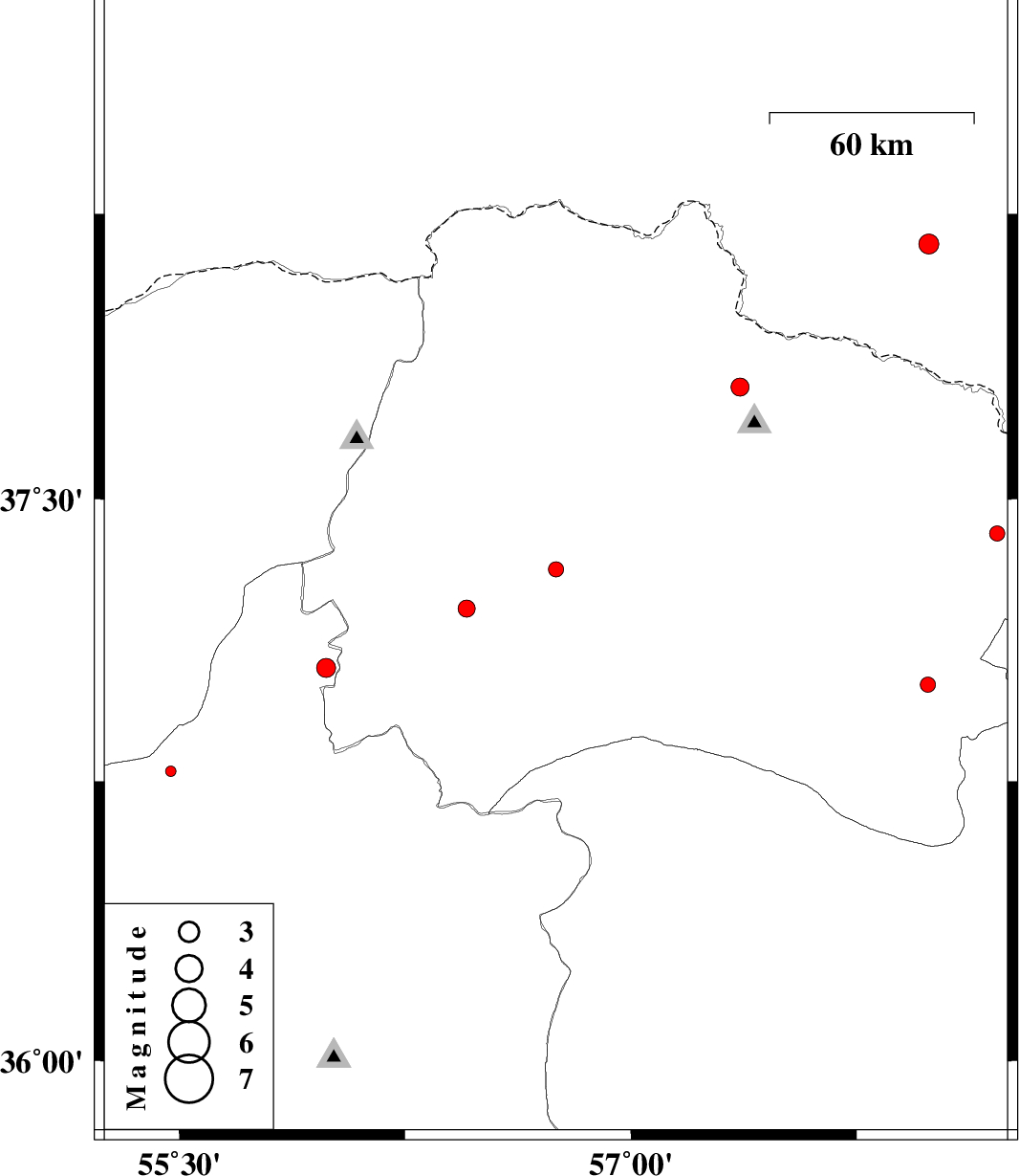 | 2015/09/17 | 19:50:29.6 | 00:20:29.6 | 37.209 | 56.455 | 14 | ML:2.6 | Khorasan(north) Province, 29 km North of Jajarm | ||