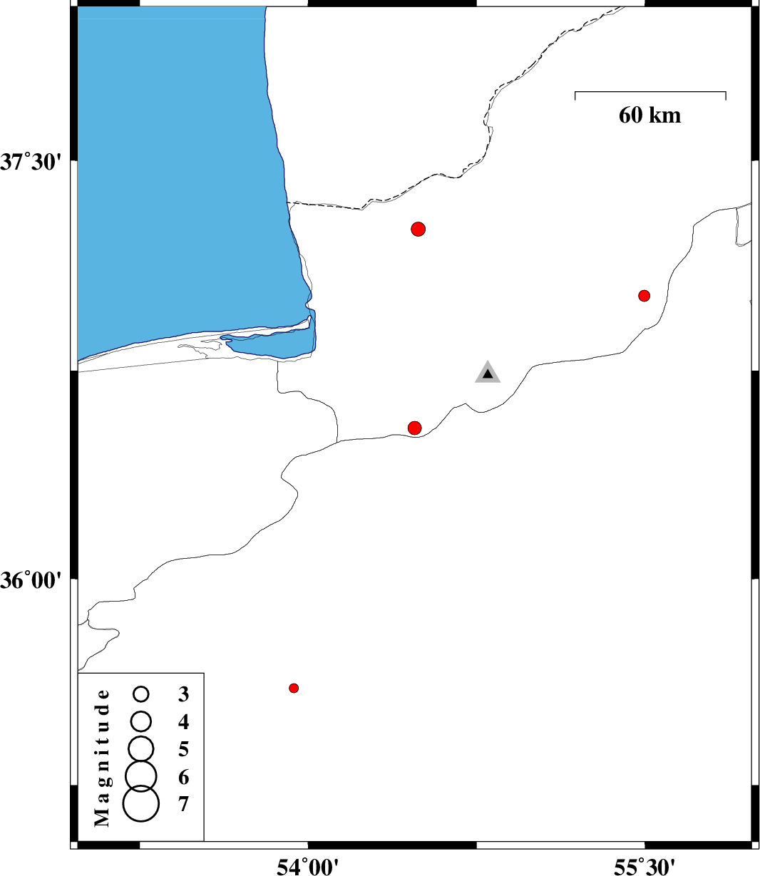 | 2015/10/09 | 20:13:40.8 | 23:43:40.8 | 37.256 | 54.49 | 14 | ML:2.8 | Golestan Province, 27 km North of Aq Qaleh | ||