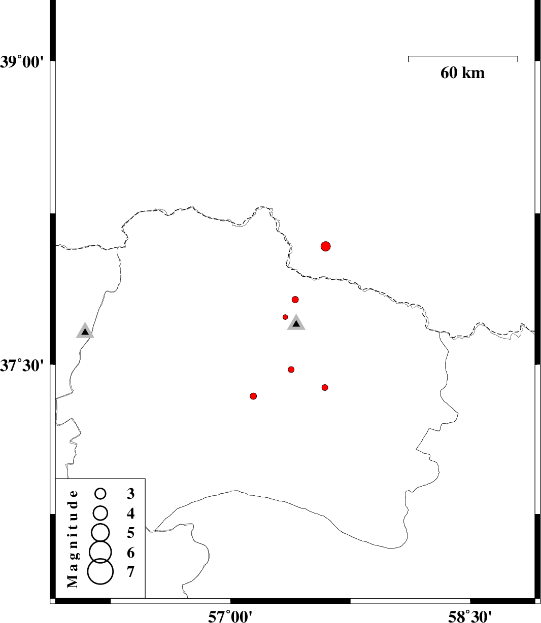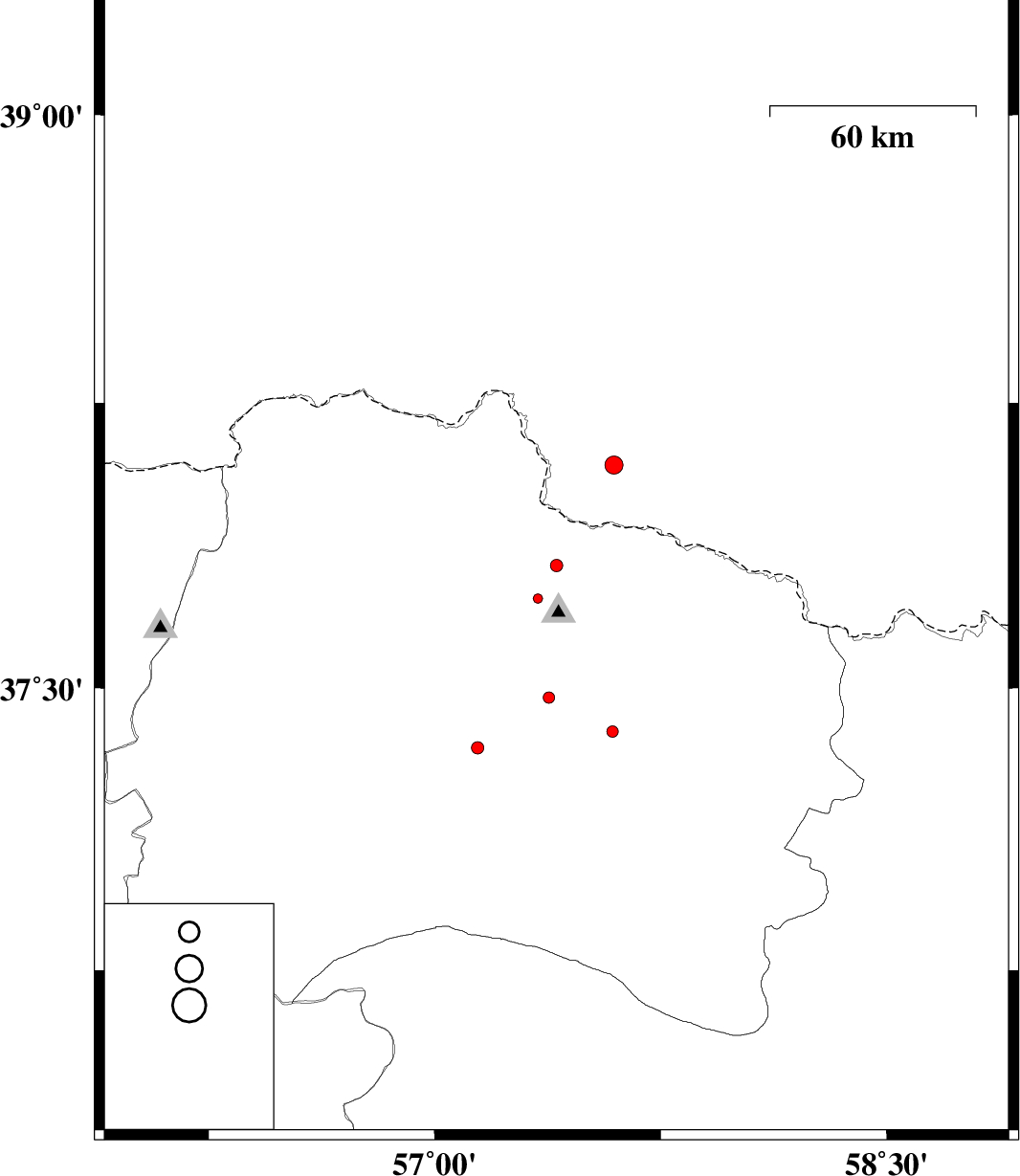 | 2015/10/10 | 02:02:59.4 | 05:32:59.4 | 37.737 | 57.343 | 6 | ML:1.4 | Khorasan(north) Province, 29 km North of Bojnurd | ||