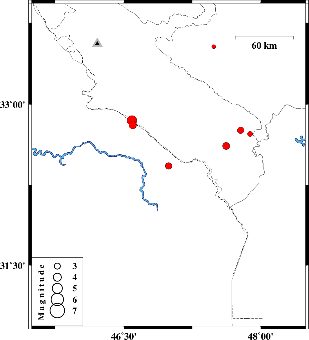 | 2015/10/04 | 03:32:40.4 | 07:02:40.4 | 32.726 | 47.883 | 14 | ML:2.5 | Ilam Province, 50 km South-East of Pol-e dokhtar | ||