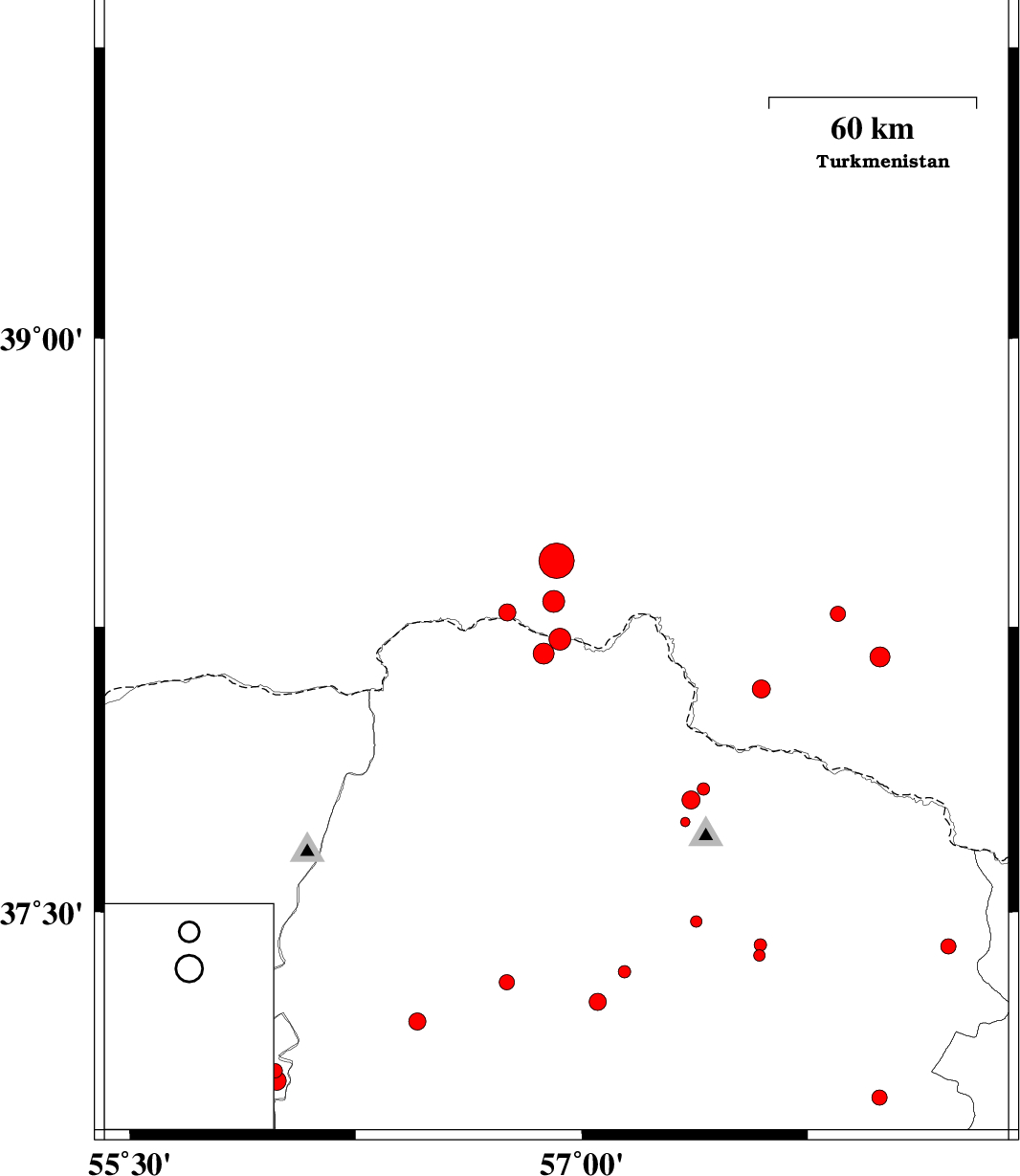 2015/10/04 13:25:40.1 16:55:40.1 38.08757.5956 ML:2.7 Turkmenistan, 72 km North-East of Bojnurd