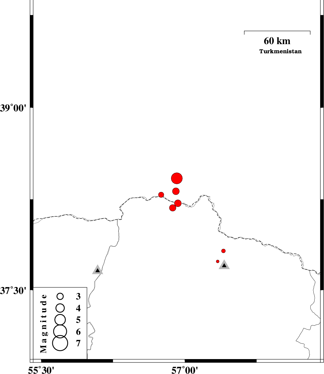 | 2015/10/12 | 21:52:47.3 | 01:22:47.3 | 38.316 | 56.907 | 6 | ML:3.3 | Turkmenistan, 85 km North of Ashkhaneh | ||