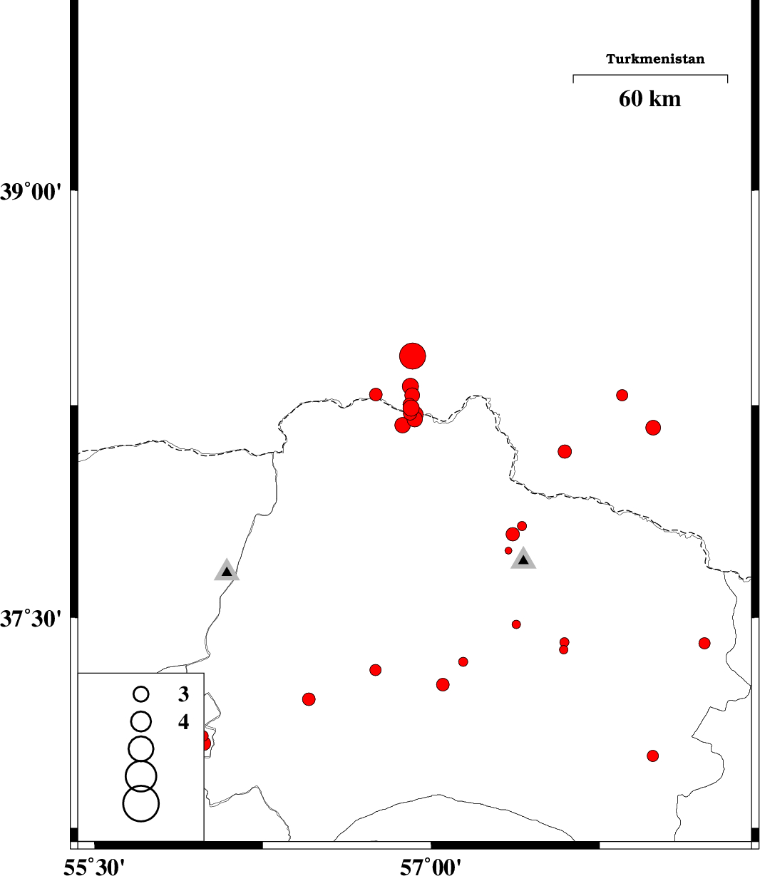 2015/10/04 13:25:40.1 16:55:40.1 38.08757.5956 ML:2.7 Turkmenistan, 72 km North-East of Bojnurd