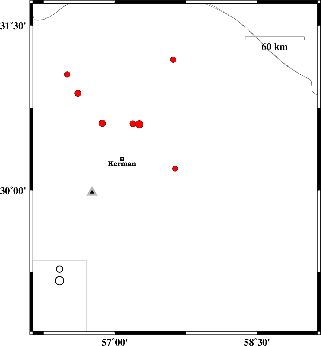 | 2015/10/09 | 06:55:55.9 | 10:25:55.9 | 30.603 | 57.259 | 14 | ML:3.7 | Kerman Province, 39 km North-East of Kerman |